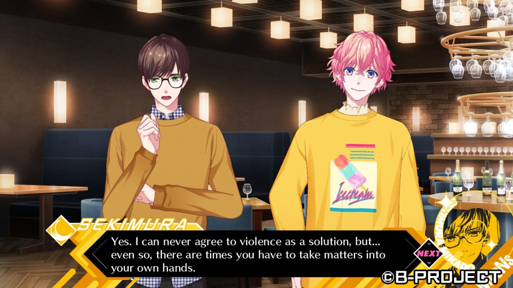 I’m actually familiar with this series as I watched a bit of the anime series back when it aired in 2016 — however, it was still a very new experience to me as I didn’t remember much from when I watched it. I went into this game blind but had an idea of how it would play out for the most part as I’ve played similar series such as UtaPri, Idolish7, and I-Chu. I want to start of by stating this is not an otome game — there are no specific routes but merely branching of stories. However, with the heroine being present in the story, there is some occasional flirting and some implications of romance here and there. One thing I really liked is that the heroine is voiced; this definitely kept me more engaged and I liked that you could hear her speak to everyone.