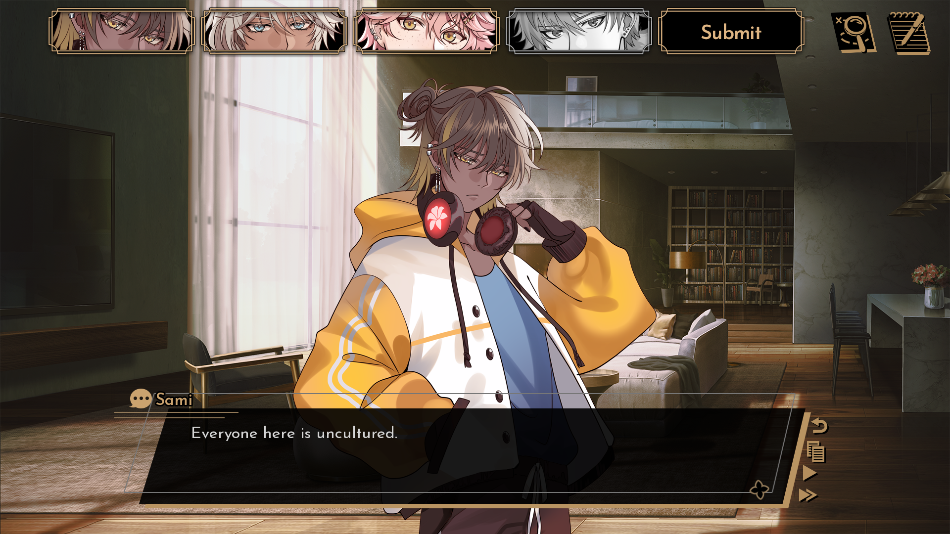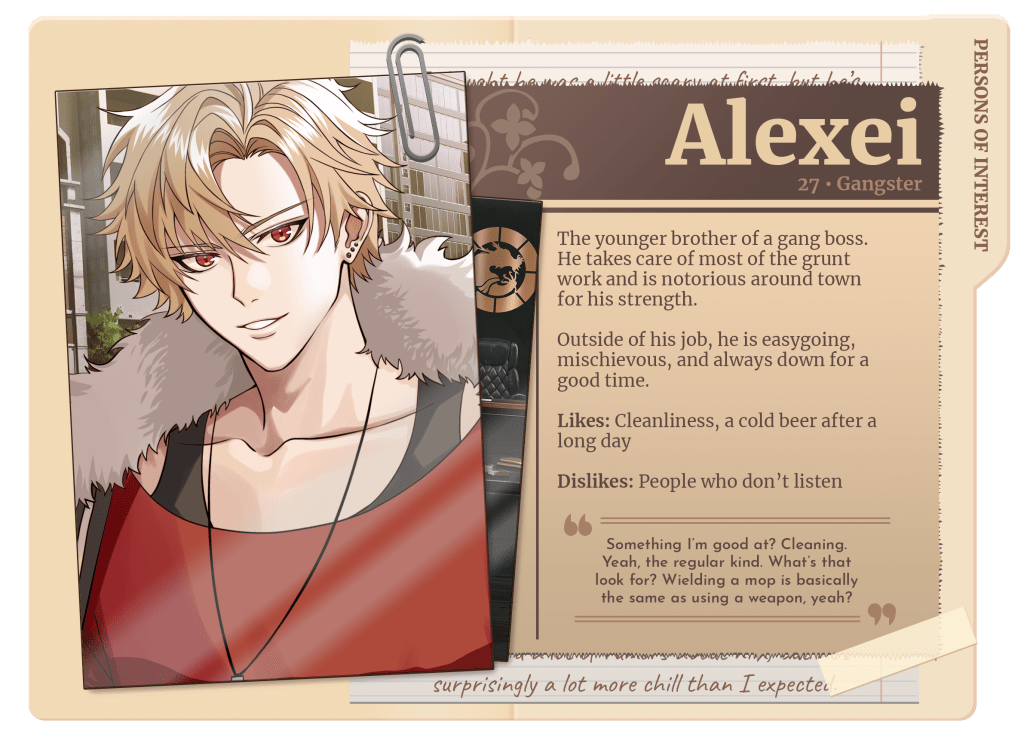 I was actually keeping tabs on this game around when the twitter account was first made and I was definitely drawn in by the promotional art / premise and now that I’ve played the demo, I can definitely see a lot of promise and potential in this game. I already mentioned earlier instances but this game is inspired a lot by Bustafellows being a mystery / crime game that has that found family aspect (along with the characters taking on certain roles and having a base house). That being said, the characters are definitely a lot more different and have their own unique personalities which I like since I never really got super attached to Bustafellow’s characters as much (aside from Mozu) and was actually more into SideKicks in a lot of ways. I also really like the detective aspect of this game and can definitely see the inspiration taken from Ace Attorney — which works really well for a detective otome game.
