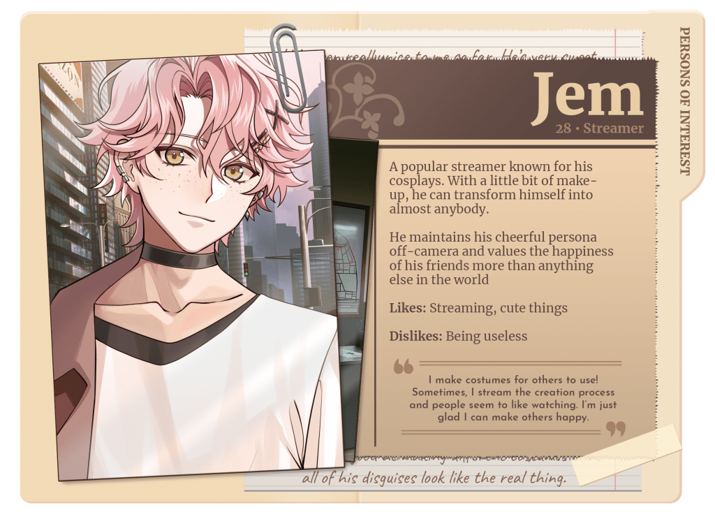 Jem is super cute and I can see ‘innocence’ radiating off him!! I can tell his role is similar to Helvetica from Bustafellows since he can disguise himself as other people (being a cosplayer) — albeit quite the opposite in personality cause he’s not a dick to the heroine at first LOL. Anyway, funnily enough he reminds me of a character they introduced in Bustafellows 2 who had a big social media following and was a bit similar in personality — but I actually like Jem’s personality / look more lol. I definitely get shy vibes from him when it comes to romance so I’m excited to see more of him and the heroine!