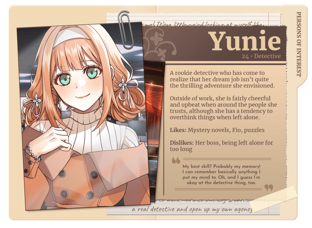 Anyway, I’ve played a ton of otome games so take my word for it when I say that this game has more life breathed into it than most Japanese otome games nowadays (at least, I’m not really into Otomate games as much anymore). I find it hard to find games that don’t feel like the same cookie cutter game remade over and over — so it’s refreshing to get something new in the realm of crime / suspense. Honestly, I think anyone who is a fan of Bustafellows, Ace Attorney, or just detective games in general would definitely like this game — so I definitely recommend the demo and trying it out yourself. That being said, make sure to check out the Kickstarter when it launches October 22nd!
