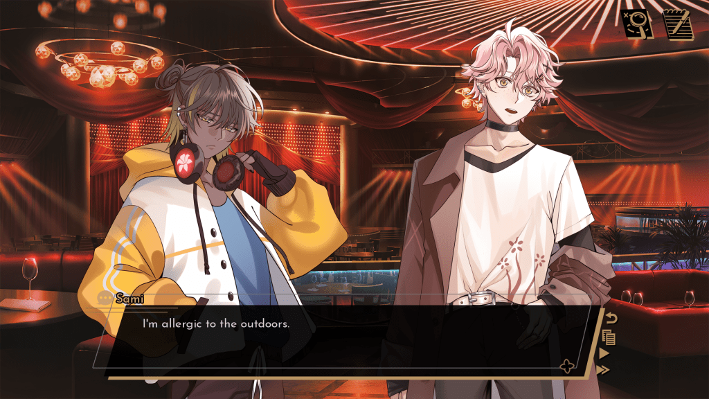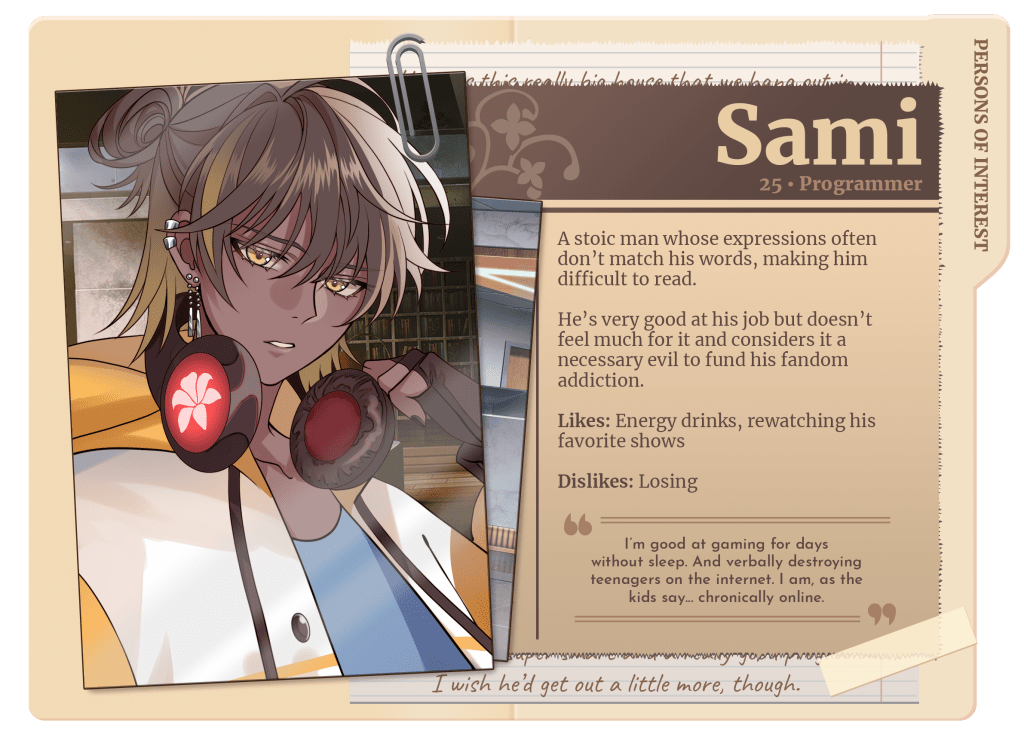 Sami was definitely one of most relatable LIs and I think he’s probably my 2nd favorite next to Alexei so far. Anyway, he’s what you’d expect to be being a gamer and whatnot — he’s the hacker of the group!! So immediately personality wise I was getting Takeru vibes from Collar x Malice but way less snarky and more of a recluse lol (which I totally get). I literally laughed when he said he was allergic to the outdoors (so relatable). Him also needing to talk about his obsession is something I know a lot of us have in us — so yeah, I like this guy a lot!! It’ll be fun to see where his route goes!