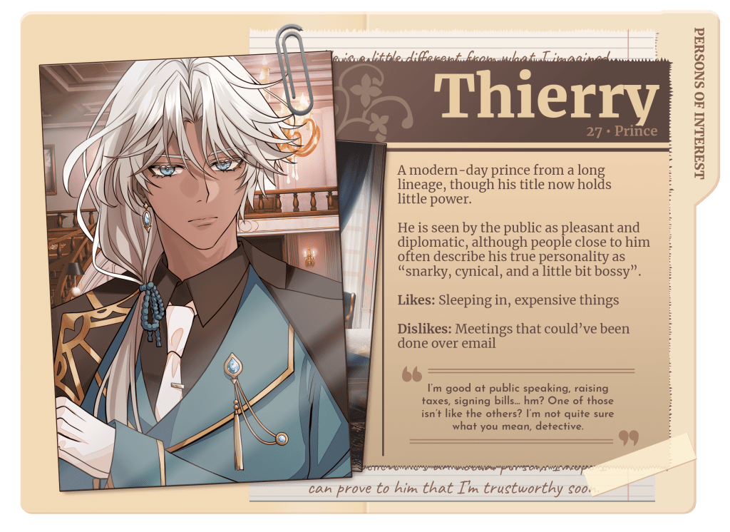 Thierry is definitely not your typical ‘prince charming’ — which I was totally fine with because I love those types that kind of have an edgy ‘mysteriousness’ to them. I also like seeing him and Alexei banter lol. He’s obviously a lot more snarkier than he looks since he has to put on appearances but I live for cynical characters so bring it on!! I definitely am looking forward to seeing more of his ‘soft side’ since he definitely doesn’t warm up to people that easily.