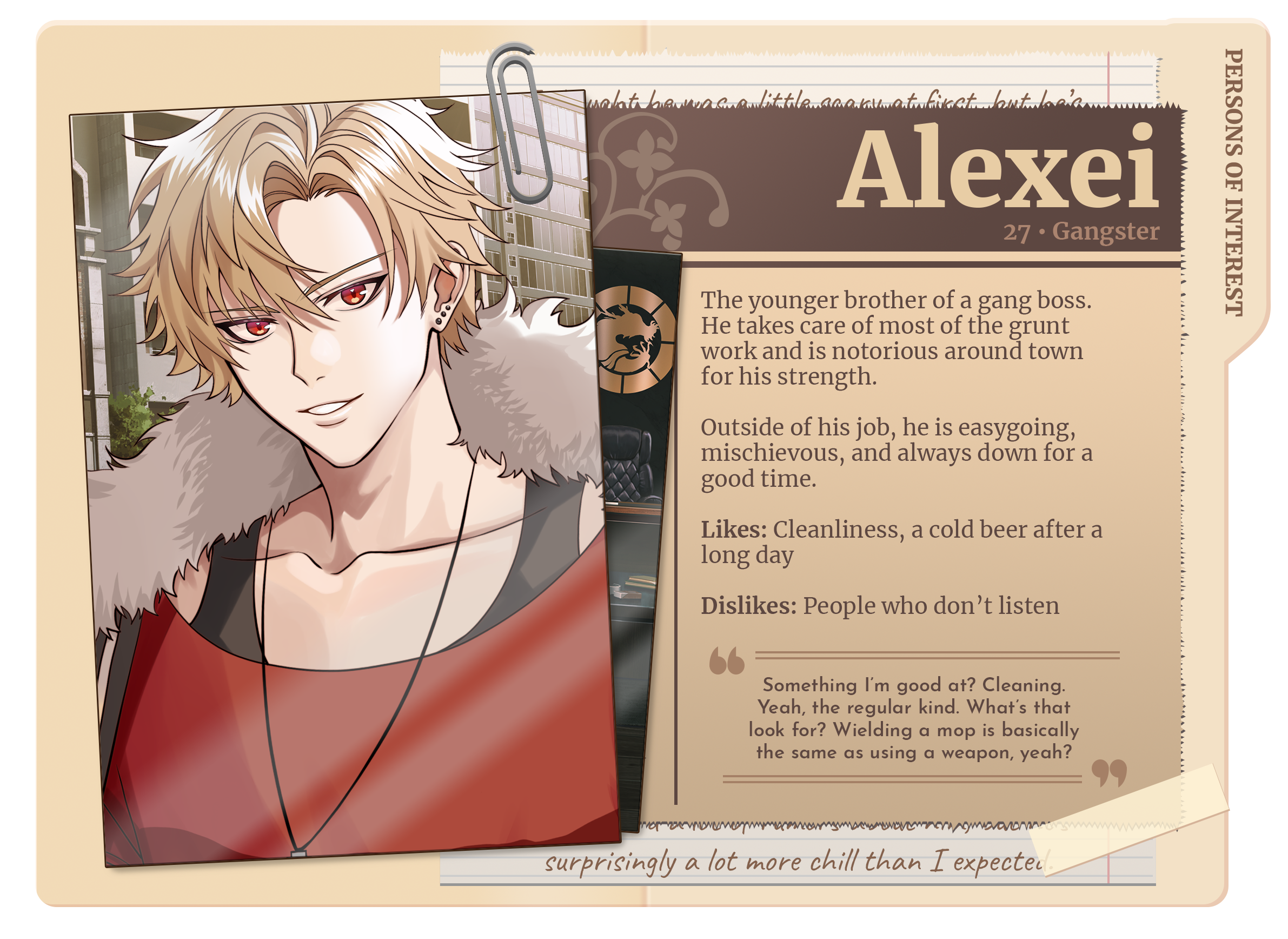 Definitely my favorite boy so far!! Based on appearance, Alexei is exactly the type of character I thought he was; sarcastic and easygoing but also very efficient in what he does. He kind of reminds me of a less serious Houou from Kenka Bancho Otome (especially that yakuza energy) or maybe even Kouga from Inuyasha…? LOL, he just gives me wolf energy. The fact that he’s a clean freak is a trait I love in characters because it’s such a fun contrast to his personality which seems to be all over the place and messy sometimes. Overall, I think he’s a sweet character overall and I’m interested in how his relationship will develop with Yunie. He also has a lot of banter with Thierry which was fun to watch.
