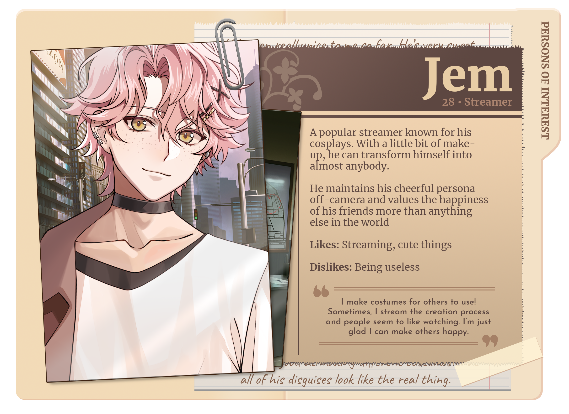 Jem is super cute and I can see ‘innocence’ radiating off him!! I can tell his role is similar to Helvetica from Bustafellows since he can disguise himself as other people (being a cosplayer) — albeit quite the opposite in personality cause he’s not a dick to the heroine at first LOL. Anyway, funnily enough he reminds me of a character they introduced in Bustafellows 2 who had a big social media following and was a bit similar in personality — but I actually like Jem’s personality / look more lol. I definitely get shy vibes from him when it comes to romance so I’m excited to see more of him and the heroine!