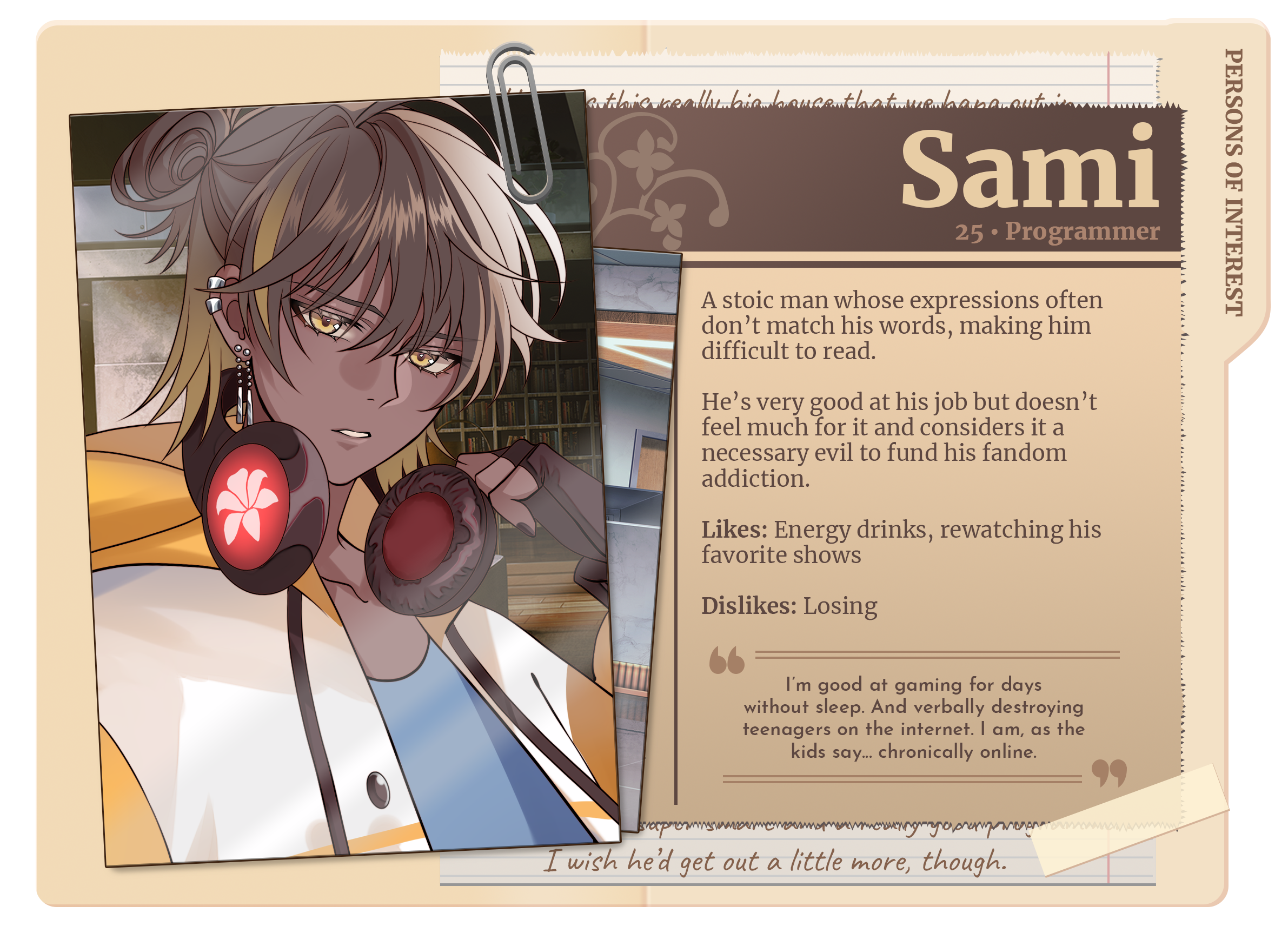 Sami was definitely one of most relatable LIs and I think he’s probably my 2nd favorite next to Alexei so far. Anyway, he’s what you’d expect to be being a gamer and whatnot — he’s the hacker of the group!! So immediately personality wise I was getting Takeru vibes from Collar x Malice but way less snarky and more of a recluse lol (which I totally get). I literally laughed when he said he was allergic to the outdoors (so relatable). Him also needing to talk about his obsession is something I know a lot of us have in us — so yeah, I like this guy a lot!! It’ll be fun to see where his route goes!