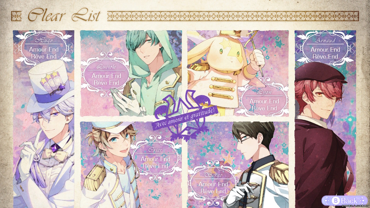 There’s six main routes in this game which include Hugo, Serge, Crier, Lyon, Luciole, and Arnaud. I’ve seen recommended route orders suggested by the developers were Hugo ⇒ Serge / Crier ⇒ Lyon / Luciole ⇒ Arnaud — but honestly doing Hugo’s route first would make everything seem less ‘surprising’ in a way so I recommend saving Hugo as the penultimate route with Arnaud being last. I honestly don’t think the order matters aside from that. Arnaud is actually locked until you do Hugo’s route so you literally can’t do his first anyway. I started with Serge because I love the kuudere megane types lol.
